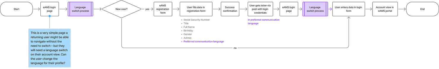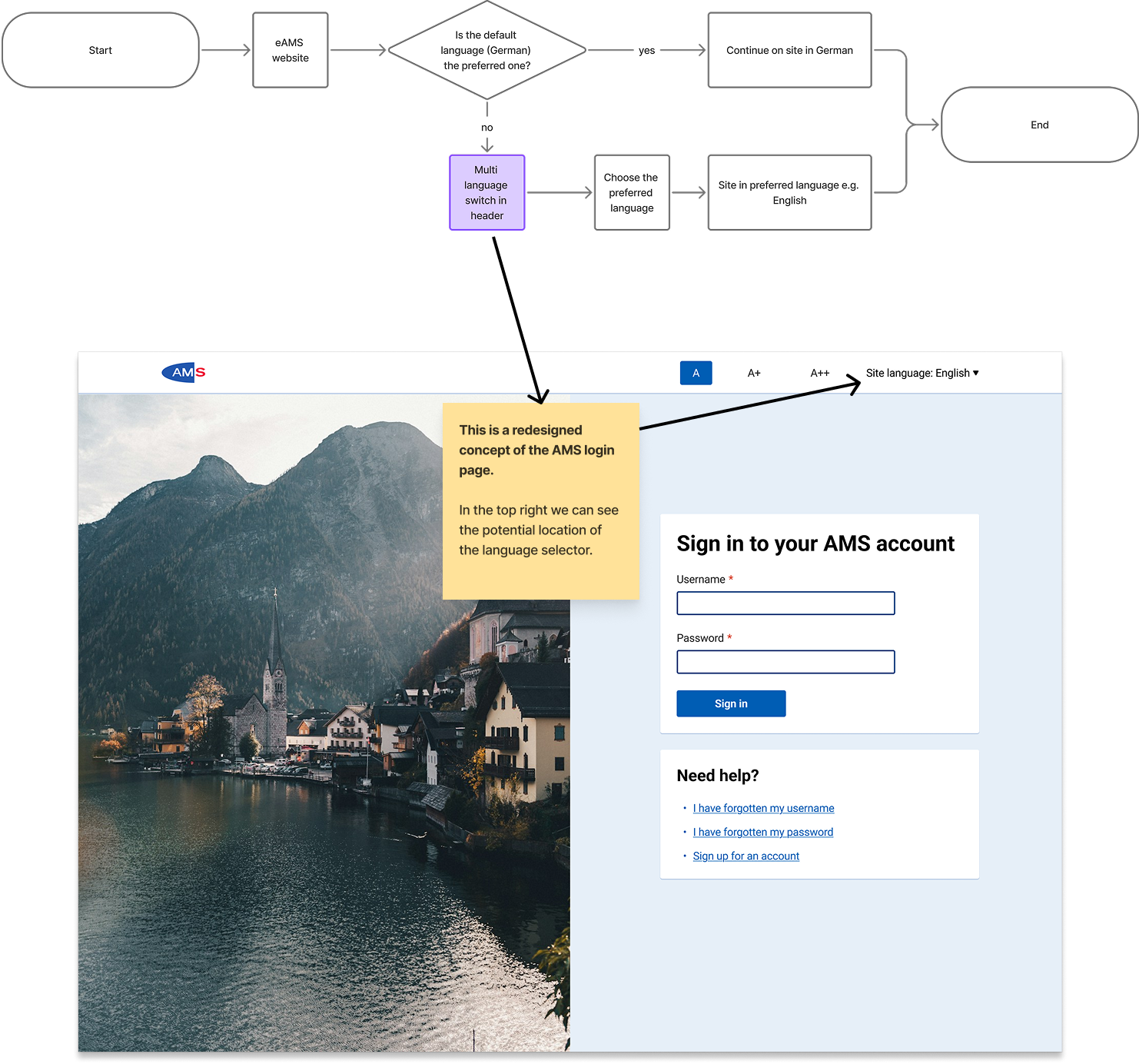 This user flow shows the process of arriving at the AMS website and choosing your preferred language. It assumes the design of the website would be changed to include a language selector in the header.