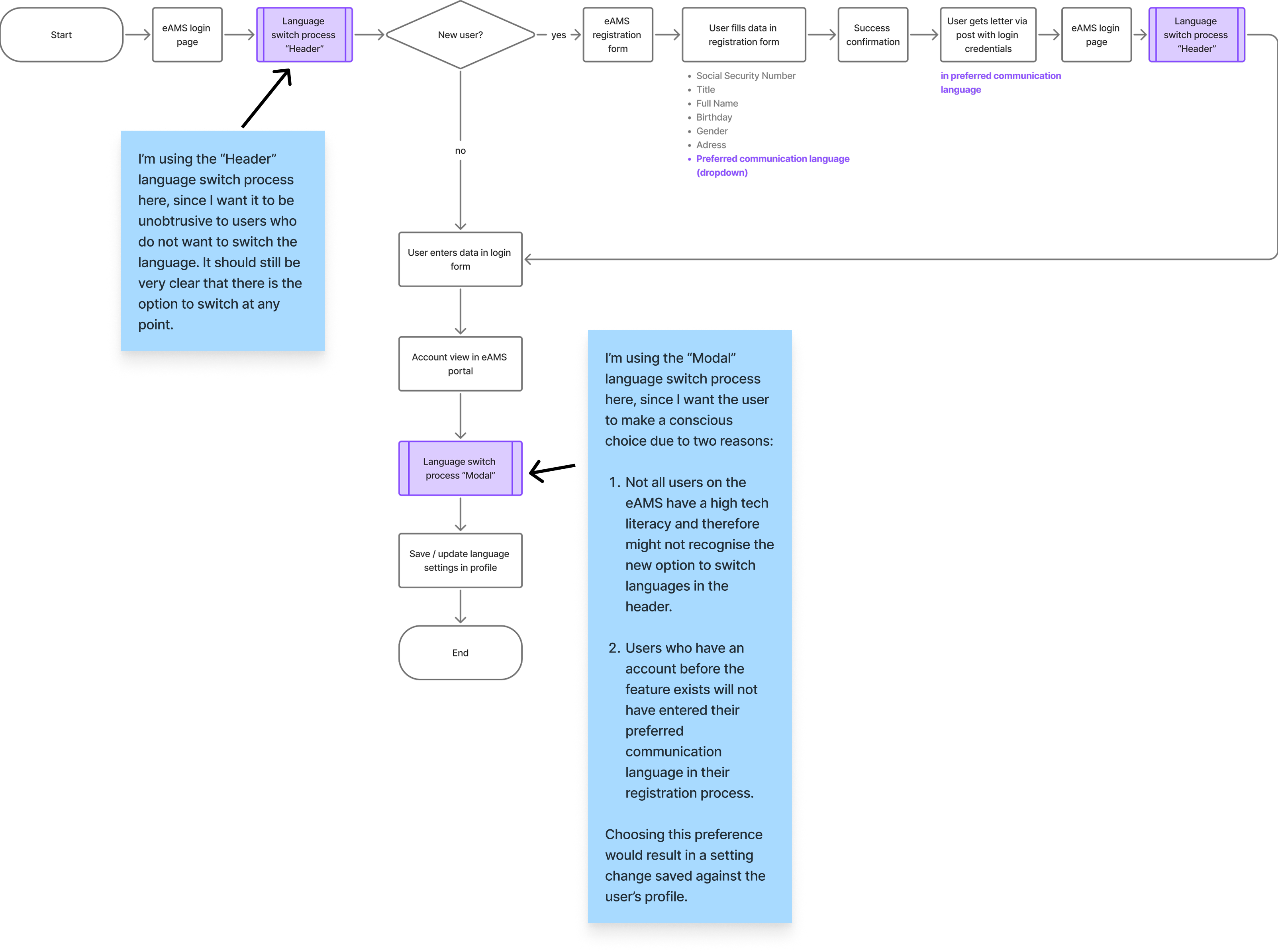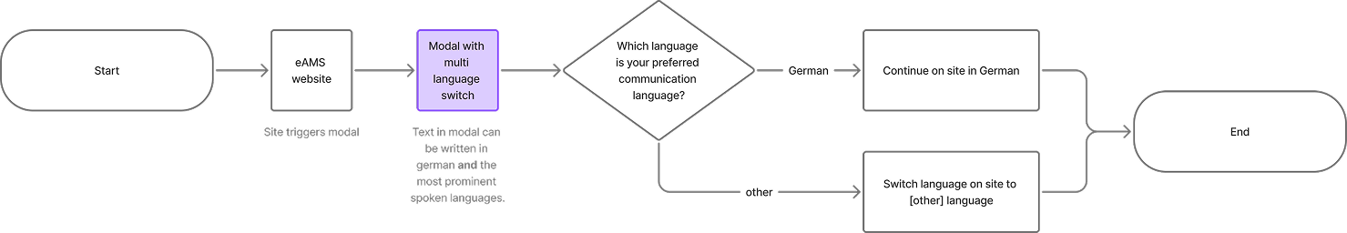 This user flow shows the process of arriving at the AMS website and a trigger causing the user to be presented with a modal/overlay in which they must choose their preferred language.This flow could be used when the detected language of the user’s browser/system differs to the default language of the website.